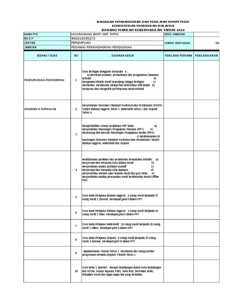 Bahagian pembangunan dan penilaian kompetensi kementerian pendidikan malaysia borang markah keberhasilan tahun 2016 gred nama pyd rajeswary a/p raman jawata dg41 n no.k.p. Contoh keberhasilan pengetua guru besar pbppp 2020 dikongsikan untuk dijadikan rujukan kepada pegawai penilai (pp) dan juga pegawai yang dinilai (pyd) yang terdiri daripada pegawai perkhidmatan pendidikan (ppp). Cara mengisi borang keberhasilan guru 2018. Pekeliling cuti isteri bersalin terkini; Contoh borang senarai semak pbd