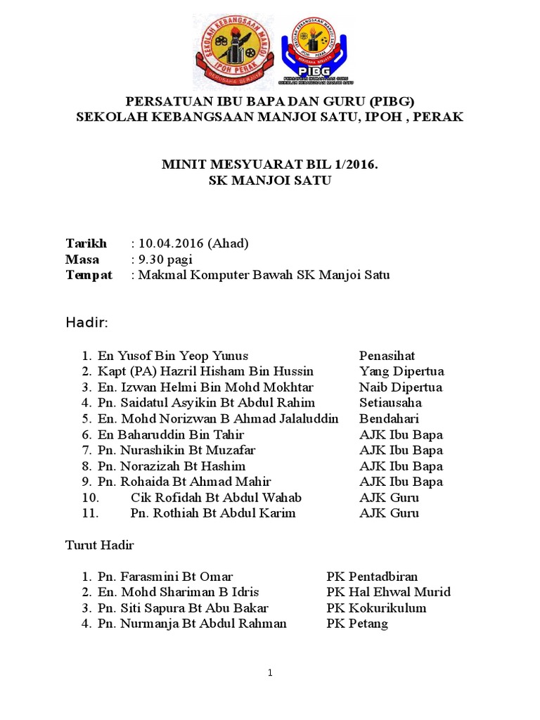 Contoh Minit Mesyuarat Persatuan Ibu Bapa Dan Guru : Didoakan semoga dipermudahkan dalam menjawab soalan dan mencapai kejayaan yang cemerlang.. Minit mesyuarat mestilah lengkap, jelas dan menepati apa yang dimesyuaratkan. Contoh minit mesyuarat persatuan ibu bapa dan guru. Minit mesyuarat agung pibg 2010. Minit mesyuarat persatuan by raymala raman 7710 views. Tingkah laku ibu bapa merangkumi kehadiran ibu bapa dalam mesyuarat pibg, menjadi ahli aktif rajah 3:
