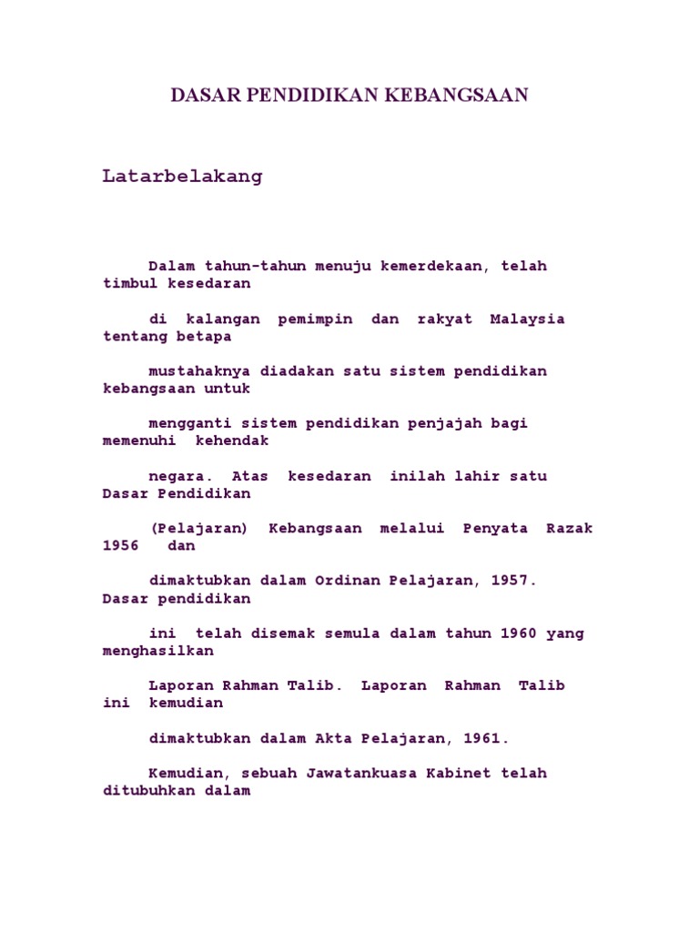 Doc Dasar Dasar Dan Hala Tuju Pendidikan Di Malaysia Arifah Azira Academia Edu from 0.academia-photos.com Dasar pendidikan kebangsaan dapat memupuk perpaduan kaum dan intergrasi nasional. Nasionalisme menjadi dasar pembentukan negara kebangsaan. Dasar pendidikan ini telah disemak semula pada tahun 1960 dan telah objektif ini telah diperkhususkan lagi setelah jawatankuasa kabinet ditubuhkan dan bidang tugasnya ditetapkan. Atas kesedaran inilah lahirnya dasar pendidikan kebangsaan, 1957. Selain itu, kerajaan juga telah. Bahawasanya dasarpelajaransepertiyang diistiharkandalamordinanpelajaran, 1957 ialahuntukmenubuhkansatusistempendidikanyang. Dasar pelajaran kebangsaan ini mula diolah kembali bagi menyesuaikan negara kita dengan perkembangan zaman. Dalam semangat kebangsaan, ketokohan perlu dijadikan sandaran pedoman (referensi) guna memberikan motivasi dan semangat bagi generasi muda.