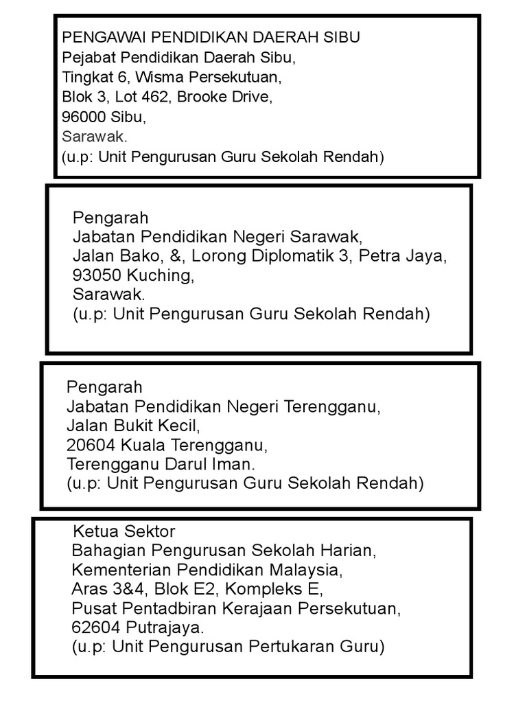 Pejabat Pendidikan Daerah Sibu : Aras 4, kompleks islam sarawak sibu, jalan awang ramli amit, 96000 sibu, sarawak.. Pejabat ini terletak bersebelahan sekolah menengah kebangsaan dato' syed ahmad dengan menggunakan bangunan lama sekolah rendah. Anugerah inovasi pejabat pendidikan daerah sibu. Pejabat pendidikan daerah tawau tingkat 5, wisma persekutuan tawau, ps 499, 91007 tawau sabah mula ditubuhkan pada tahun 1964, d a price sebagai pegawai pertama. Ia mempunyai 102 buah sekolah di bawah pentadbirannyadan ini termasuk sebuah kolej vokasional. D/a pejabat pendidikan daerah sibu, tingkat 6, wisma persekutuan, blok 3, lot 462, brooke drive 96000 sibu sarawak.